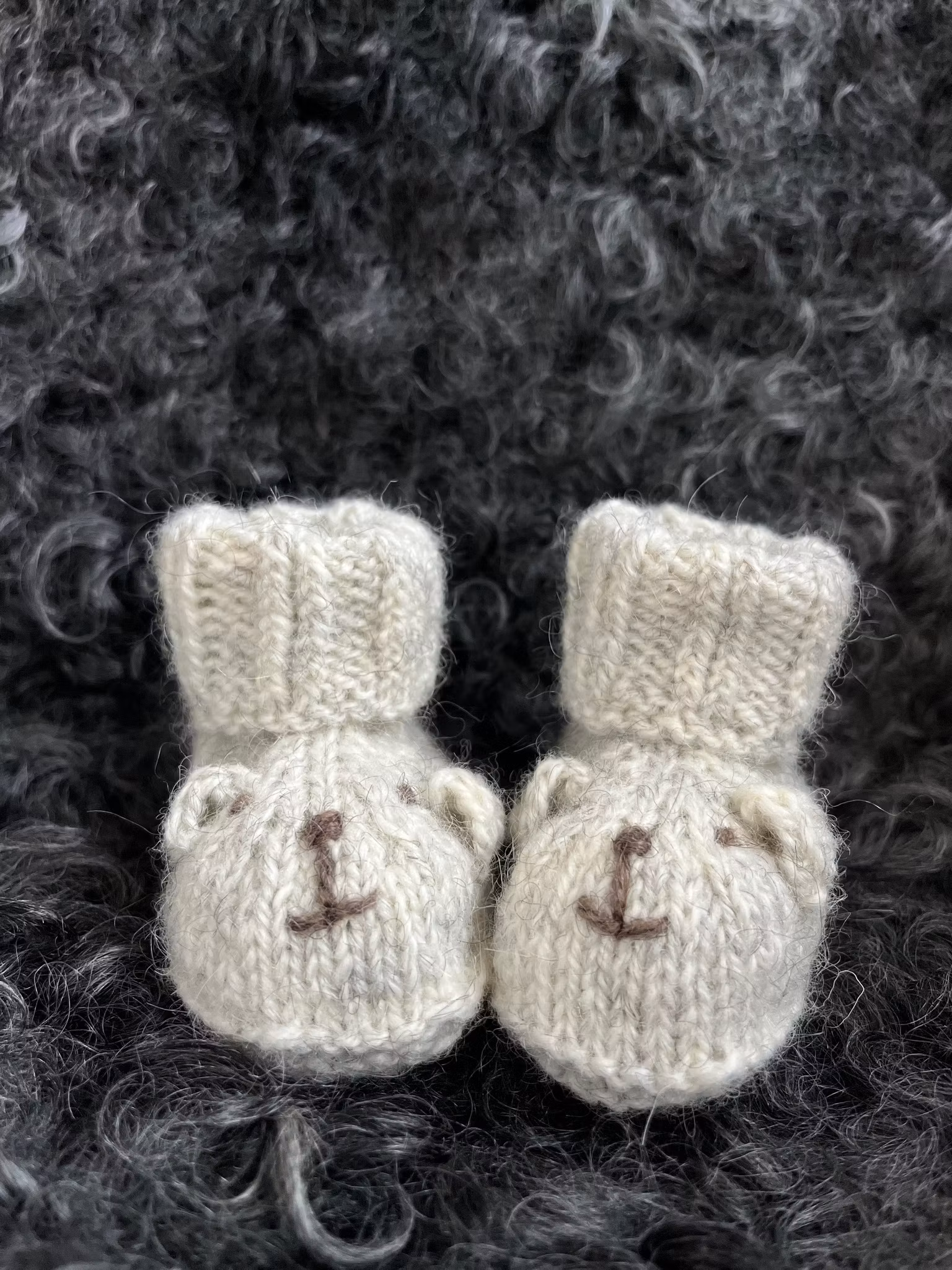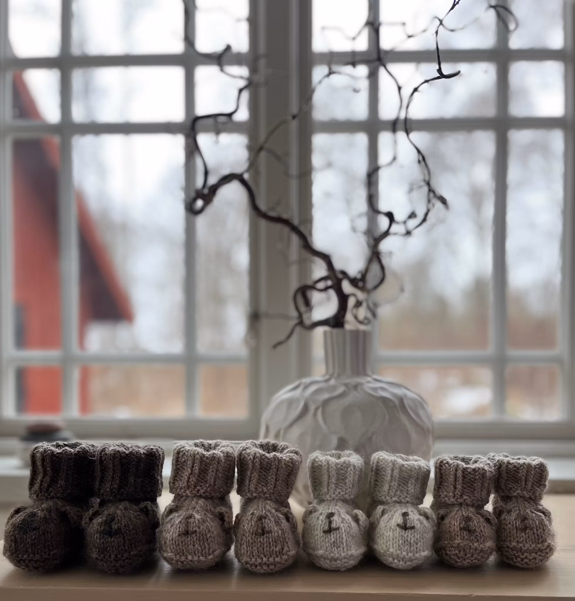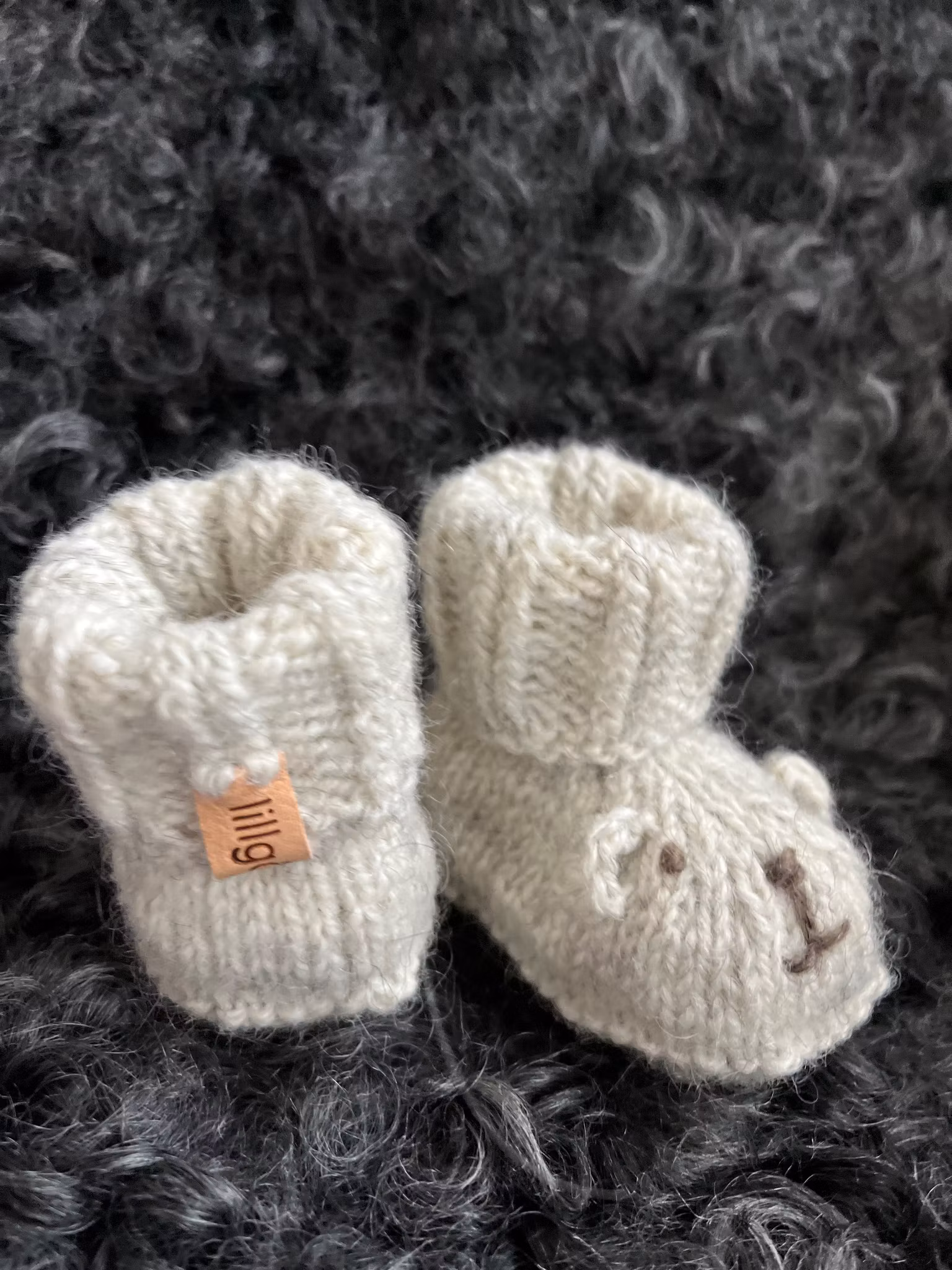 Teddytøflerne på billedet er strikket i håndværksgarn fra Hjelholts Uldspinderi i farven sand